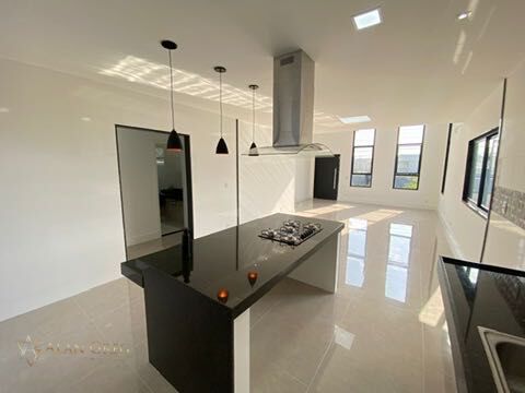 cozinha integrada com fogao cooktop e coifa